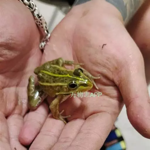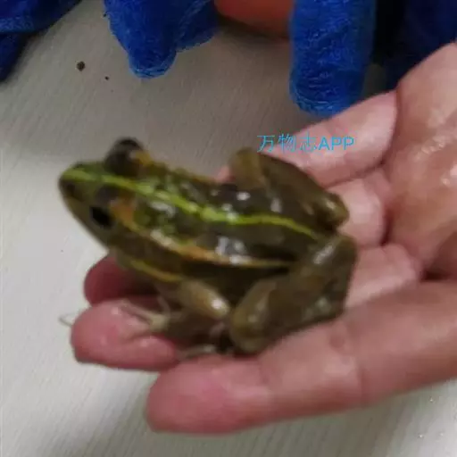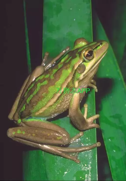 金线蛙 金线蛙体型肥硕,成年体长约50毫米(雄体略小),头长约等于头宽,吻端钝圆。鼓膜大而明显棕黄色,颞褶不显著。背部绿色杂有一些黑色斑点,有两长条褐色斑,从吻端一直延伸到泄殖腔口,形成明显的绿色的背中线。体侧绿色有些黑斑,两侧各有一条粗大的褐色、白色或浅绿色的背侧褶。皮肤光滑,但在背部及体侧有些疣粒。腹部光滑,黄白色带有一些棕色点。前肢指细长无蹼。后肢粗短有黑色横带,趾间蹼发达为全蹼。股部内侧黑色有许多小白斑。雌蛙体型比雄蛙大很多。雄蛙有一对咽侧内鸣囊,第一指有婚埝。