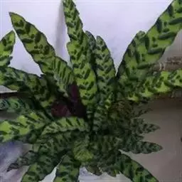 根出叶,叶长椭圆状披针形,全缘,叶面深绿色,具有淡绿、白至淡粉红色羽状斑彩,叶柄及叶背暗红色。叶长椭圆形,叶缘稍有波浪形起伏状,叶面七彩斑斓。