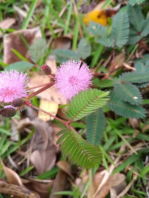 含羞草(学名:Mimosa pudica Linn. ):为豆科多年生草本或亚灌木,由于叶子会对热和光产生反应,受到外力触碰会立即闭合,所以得名含羞草。形状似绒球。开花后结荚果,果实呈扁圆形。叶为羽毛状复叶互生,呈掌状排列。大约在盛夏以后开花,头状花序长圆形,2-3个生于叶腋。花为白色、粉红色,花萼钟状,有8个微小萼齿,花瓣四裂,雄蕊四枚,子房无毛。荚果扁平,每荚节有1颗种子,成熟时节间脱落。花期9月。
