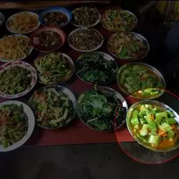 滑豆腐2块、鲜冬菇(切片)3只、珍珠笋数条、红萝卜片数片、菜心数棵、上汤1/2(汤)碗
