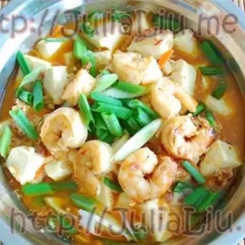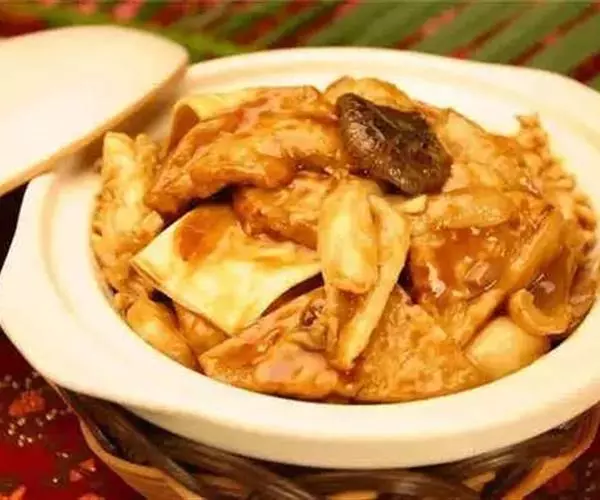 3、烧热 砂窝下油1汤匙,放入豆腐,再加入冬菇片、珍珠笋、红萝卜花、菜心,再注入上汤,慢火煮至汁液浓稠,打献汁(埋芡),即可上桌。要趁热进食。