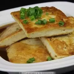 1. 把豆腐切成厚3 厘米、长6 厘米的方块,用旺火烤至淡黄色;