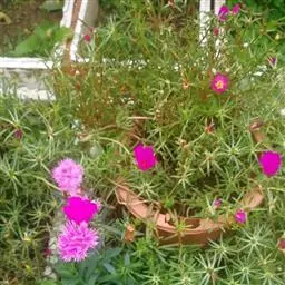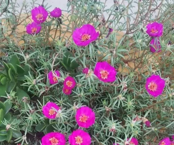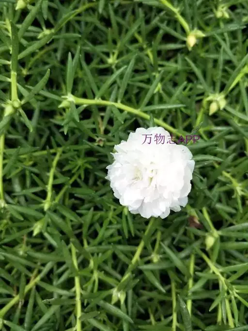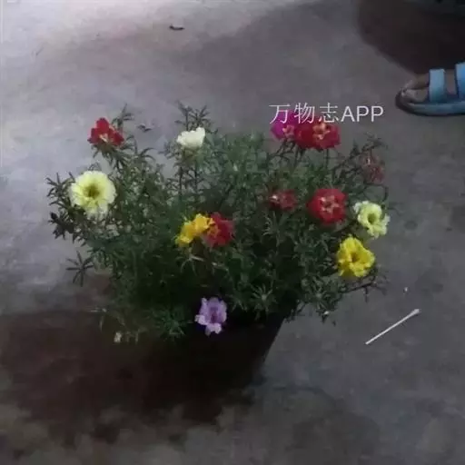 大花马齿苋(学名:Portulaca grandiflora Hook.):一年生草本,高10-30厘米。茎平卧或斜升,紫红色,多分枝,节上丛生毛。叶密集枝端,较下的叶分开,不规则互生,叶片细圆柱形,无毛。花单生或数朵簇生枝端,直径2.5-4厘米,日开夜闭;总苞8-9片,叶状,轮生,具白色长柔毛;花瓣5或重瓣,倒卵形,顶端微凹,长12-30毫米,红色、紫色或黄白色。蒴果近椭圆形,盖裂;种子细小,多数,圆肾形,直径不及1毫米。花期6-9月,果期8-11月。
