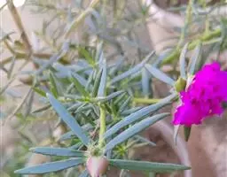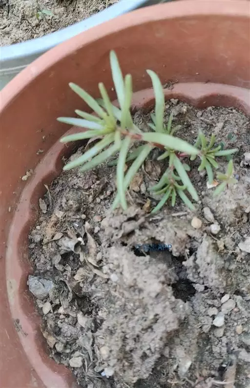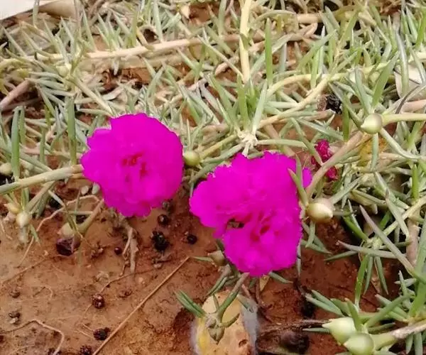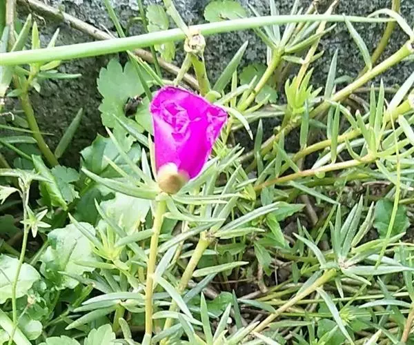 大花马齿苋一年生草本,高10-30厘米。茎平卧或斜升,紫红色,多分枝,节上丛生毛。叶密集枝端,较下的叶分开,不规则互生,叶片细圆柱形,有时微弯,长1-2.5厘米,直径2-3毫米,顶端圆钝,无毛;叶柄极短或近无柄,叶腋常生一撮白色长柔毛。
