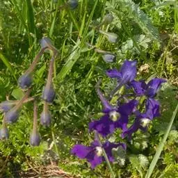 花3-6朵,近直立;苞片线状深裂;花梗长2-4厘米;萼片开展,蓝紫色,罕为白色,卵形,长1.5-2厘米,宽0.9-1.2厘米,顶端钝;花瓣瓣片钝圆形,长3-5毫米,具短距,距长3-5毫米,末端直或微弯;雄蕊比萼片短,花药黄色;退化雄蕊狭椭圆形,白膜质,长5-6毫米,边缘皱曲;心皮5,被腺状柔毛。