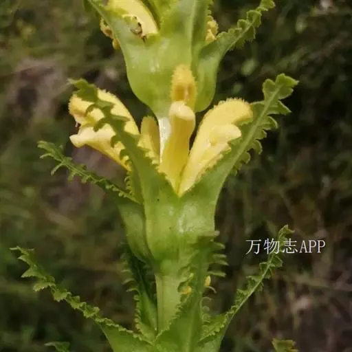 花序总状,其花轮尤其在下部者远距,苞片基部均膨大而结合为4,脉纹明显,前半部叶状而羽状分裂;花无梗;萼长10-12毫米,膜质无毛,齿退化成2枚,宽而圆钝;花冠黄色,长约3厘米,直立,管长20-25毫米,宽2.5-4毫米,在萼内微微弯曲使花前俯,盔背部有毛,先端下缘有细齿1对,下唇以锐角开展,中裂小;雄蕊花丝两对均被毛;花柱伸出于盔端。