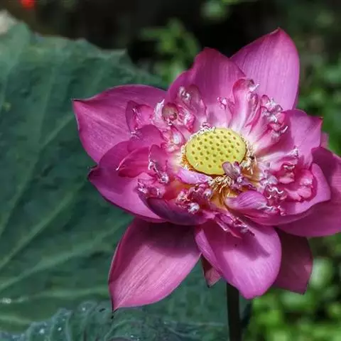 芡实(学名:Euryale ferox Salisb. ex Konig et Sims):睡莲科芡属一年生水生草本植物。沉水叶箭形或椭圆肾形,浮水叶革质,椭圆肾形至圆形,叶柄及花梗粗壮,花内面紫色;萼片披针形,花瓣紫红色矩圆披针形或披针形,浆果球形,污紫红色,种子球形,黑色。7-8月开花,8-9月结果。