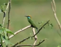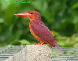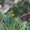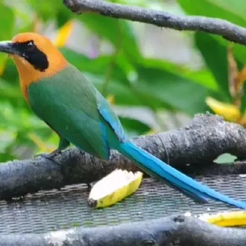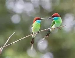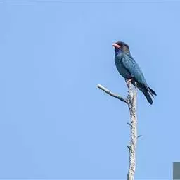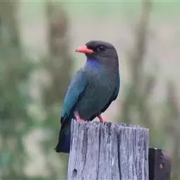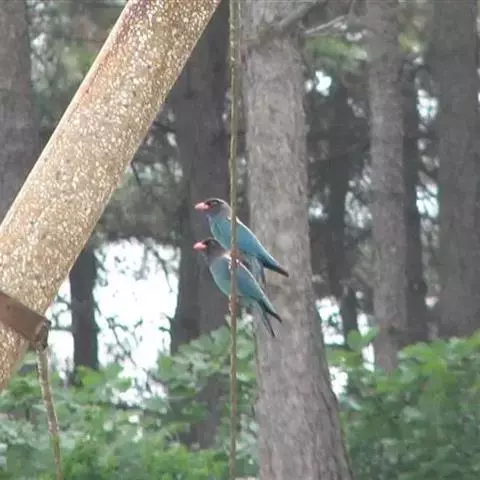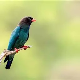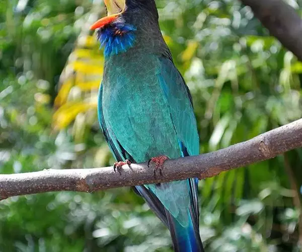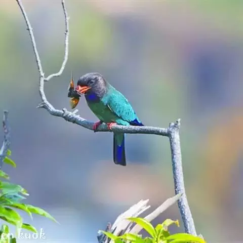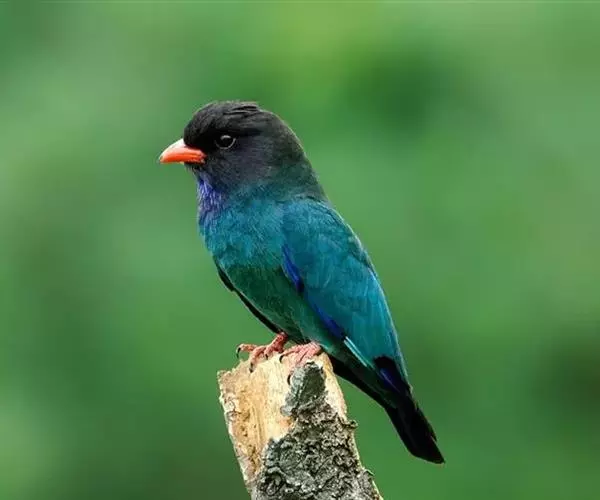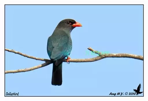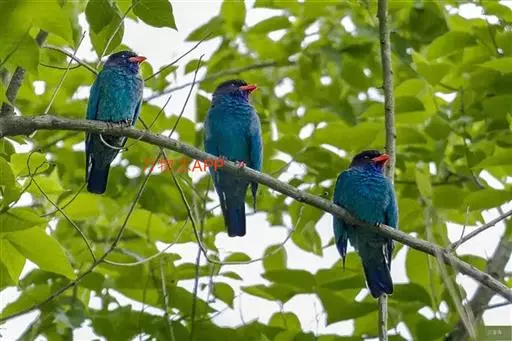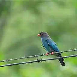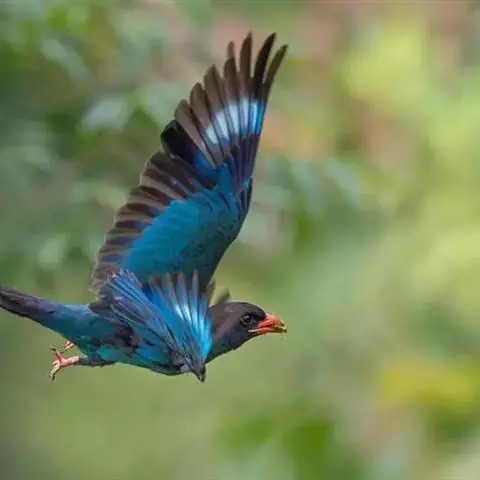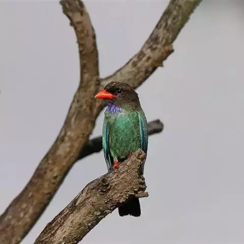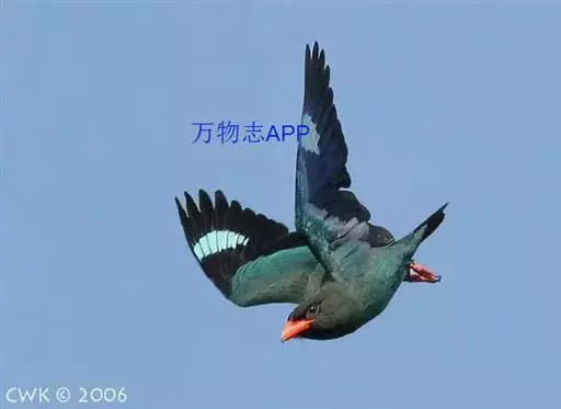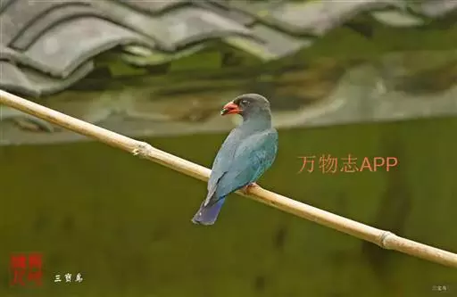 三宝鸟(学名:Eurystomus orientalis)为佛法僧目三宝鸟属下的一种中小型攀禽,共有10个亚种,体长26-29厘米,体重107-194克。通体蓝绿色,头和翅较暗,呈黑褐色,初级飞羽基部具淡蓝色斑,飞翔时甚明显。虹膜暗褐色,嘴、脚红色。常长时间地站在林缘路边高大乔木顶端枯枝上,或在空中成圈飞翔和上下飞翔,边飞边“嘎嘎”地鸣叫。 如发现飞行中昆虫,则追赶捕食,如果在地上发现蜥蝪或昆虫,则如伯劳采饵,在地上以跳跃代步行捕食。