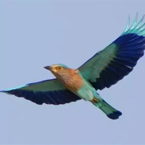 蓝胸佛法僧中型鸟类,体长31~33厘米,通体淡蓝绿色。翅膀长而宽,除栗色背羽外大部分为蓝色。…