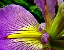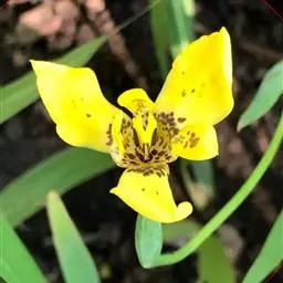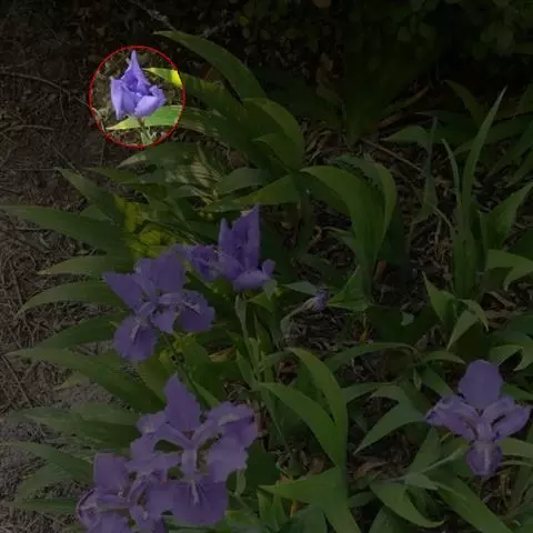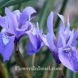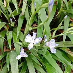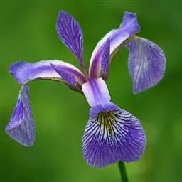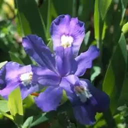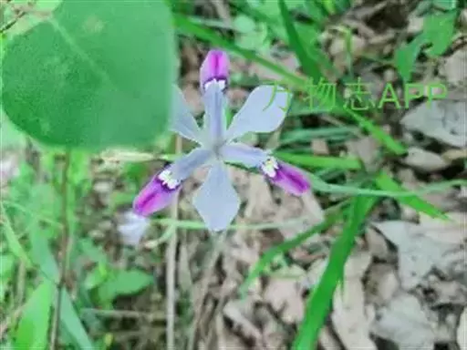 小花鸢尾(学名:Iris speculatrix Hance):多年生草本,植株基部围有棕褐色的老叶叶鞘纤维及披针形的鞘状叶。根状茎二歧状分枝,斜伸,棕褐色;根较粗壮,少分枝。叶略弯曲,暗绿色,有光泽,剑形或条形,有3-5条纵脉。花茎光滑,不分枝或偶有侧枝,有1-2枚茎生叶;苞片2-3枚,草质,绿色,狭披针形,内包含有1-2朵花;外花被裂片匙形,有深紫色的环形斑纹,内花被裂片狭倒披针形,直立。蒴果椭圆形,顶端有细长而尖的喙;种子为多面体,棕褐色,旁附有小翅。花期5月,果期7-8月。
