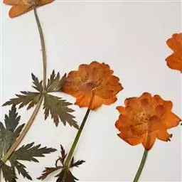 (2)宽瓣金莲花 花皱缩,湿润展平后,直径2.5-4.8cm;萼片10-20,橙黄色,宽椭圆形或倒卵形,长1-2.2cm,宽0.6-1.7cm,全缘或先端有不整齐小齿;花瓣18-22棕色,匙状线形,与萼片等长或稍短;雄蕊多数;于房多数,聚合,花柱短尖。气微,味苦。