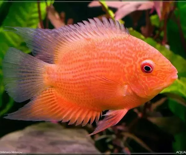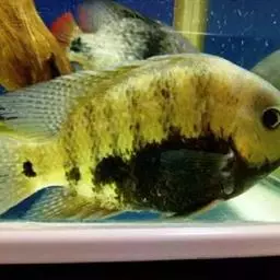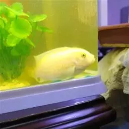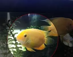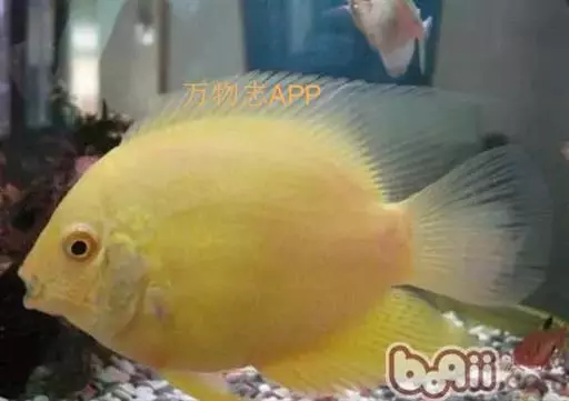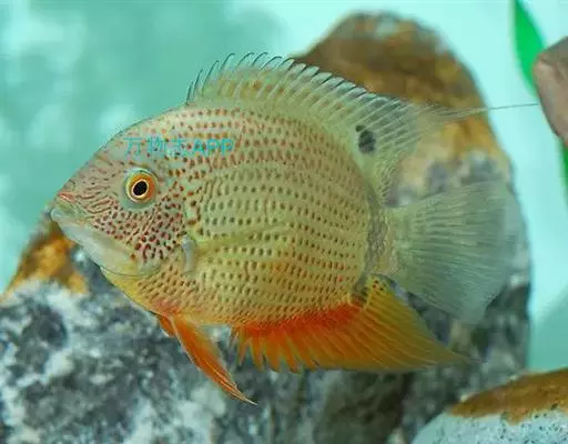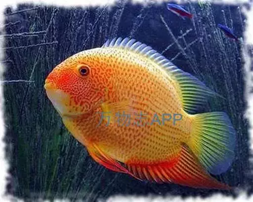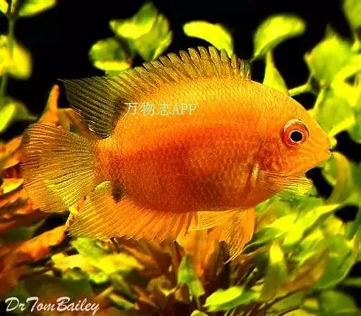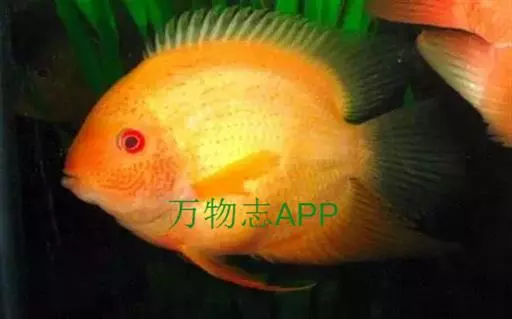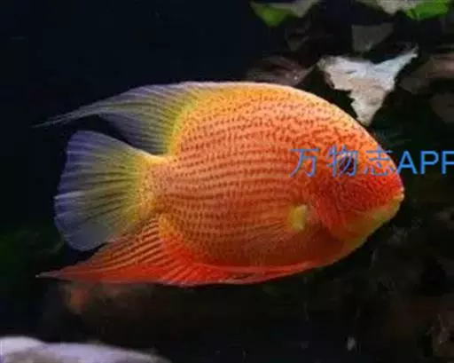 金菠萝鱼,Cichlasoma severum,慈鲷科丽体鱼属。成鱼体长20~25cm,厚侧扁形,侧面观椭圆形,口裂较小,体色为橙色,鳃盖上布满红色小点,喜欢弱酸性至中性水质,适宜水温25~30℃,偏动物性的杂食性,喜欢底栖无脊椎动物如水蚯蚓、摇蚊幼虫之类,主要分布于巴西、圭亚那境内,亚马逊流域。