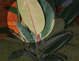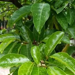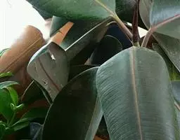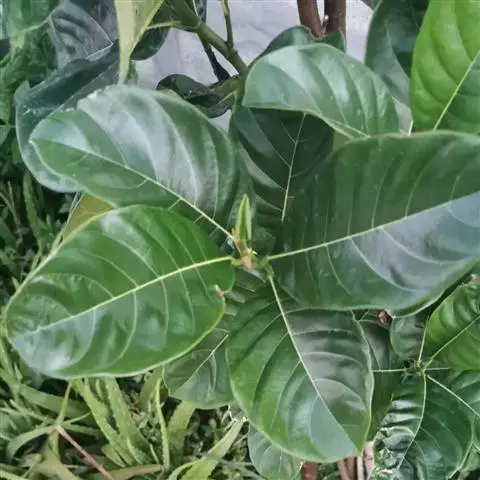 常绿乔木,高10-20米,胸径达30-50厘米;老树常有板状根;树皮厚,黑褐色;小枝粗2-6毫米,具纵绉纹至平滑,无毛;托叶抱茎环状,遗痕明显。叶革质,螺旋状排列,椭圆形或倒卵形,长7-15厘米或更长,宽3-7厘米,先端钝或渐尖,基部楔形,成熟之叶全缘,或在幼树和萌发枝上的叶常分裂,表面墨绿色,干后浅绿或淡褐色,无毛,有光泽,背面浅绿色,略粗糙,叶肉细胞具长臂,组织中有球形或椭圆形树脂细胞,侧脉羽状,每边6-8条,中脉在背面显著凸起;叶柄长1-3厘米;托叶抱茎,卵形,长1.5-8厘米,外面被贴伏柔毛或无毛,脱落。