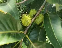 坚果卵形至卵圆形,直径0.8-1.2厘米,高1.7-2厘米,果脐平坦。花期3-4月,果期9-10月。