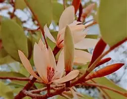 花蕾卵圆形,花先叶开放,浅红色至深红色,花被片6-9,外轮3片花被片常较短约为内轮长的2/3;雄蕊长1-1.2厘米,花药长约5毫米,侧向开裂,药隔伸出成短尖,雌蕊群无毛,圆柱形,长约1.5厘米。