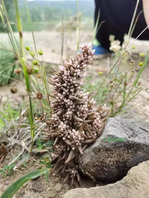 本品茎呈细长圆柱形,长5~27cm,直径2~6mm。表面灰棕色,具多数突起的残留叶基,有明显的纵棱线。叶多脱落。破碎或卷曲,灰绿色。圆锥花序穗状,小花白色或粉红色,花梗长约5mm。体轻,质脆,易碎。气微,味酸。