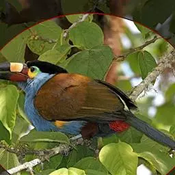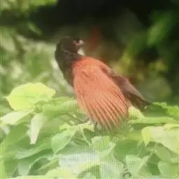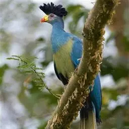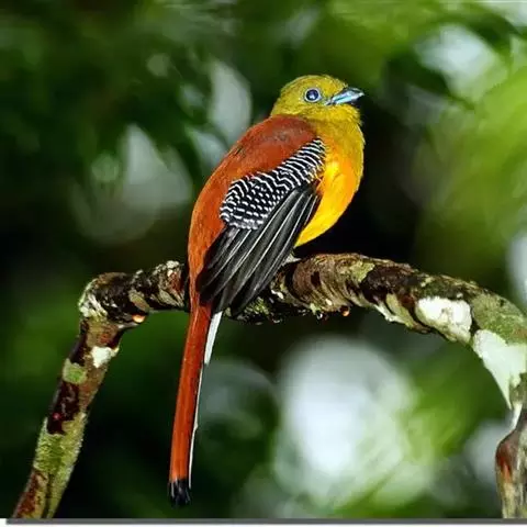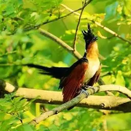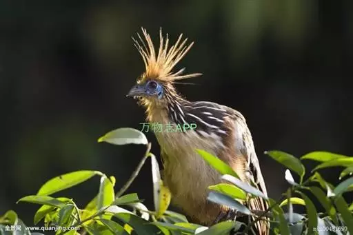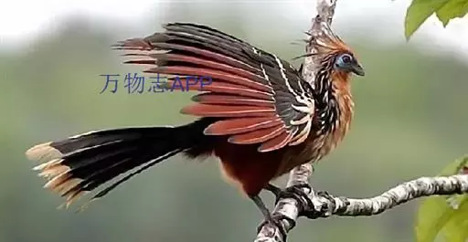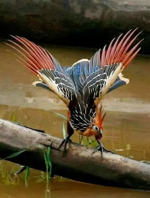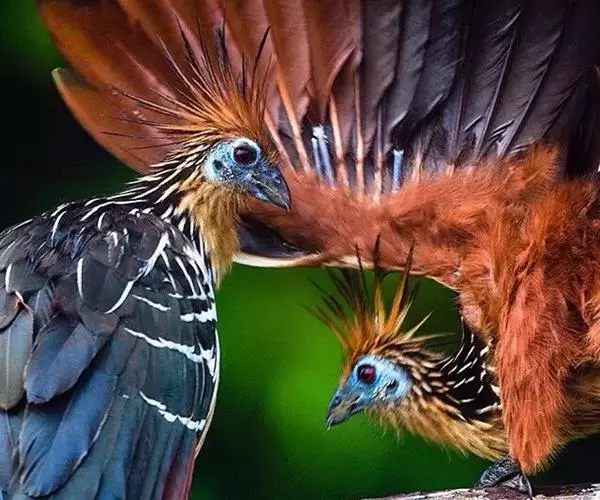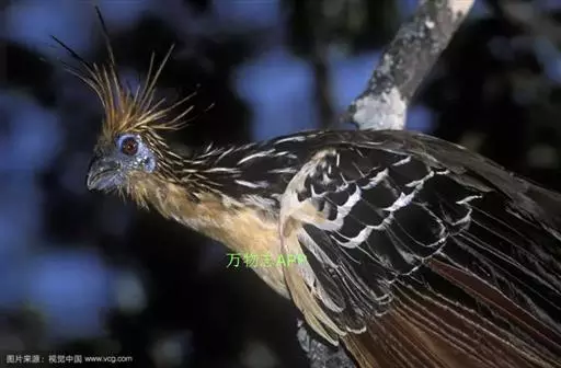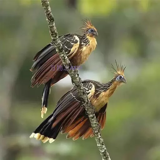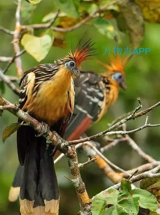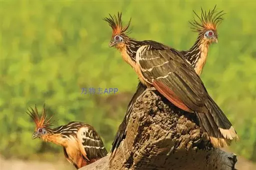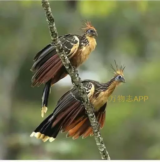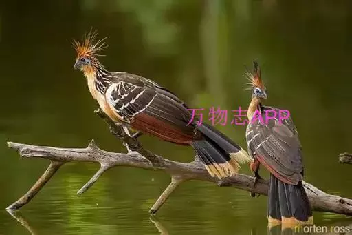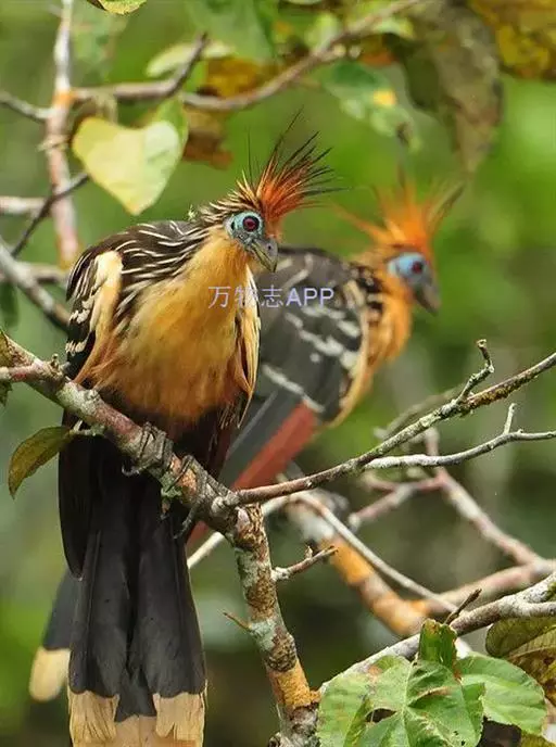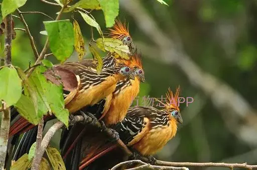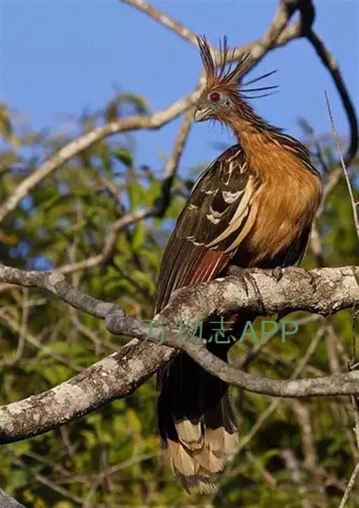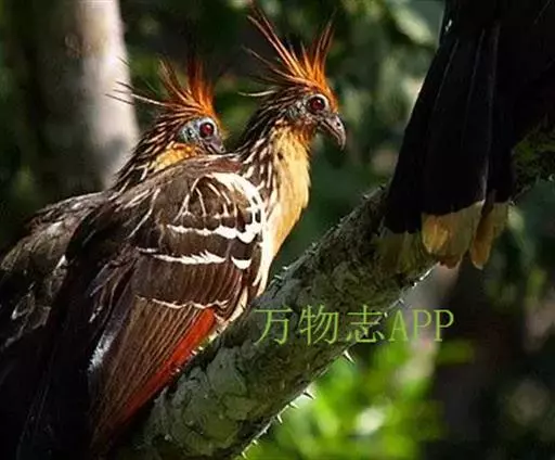 麝雉(学名:Opisthocomus hoazin):体长约65厘米,体重不及1 千克。雌雄相似,头上有由长短不一的羽毛组成的羽冠,身体背部有带白色条纹的棕色羽毛,尾羽和靠近尾部的后腹部羽毛是土红色的,而前胸则是奶黄色的。它的脸呈天蓝色。麝雉嗉囊极大,分为两部分,用于贮存和消化海芋属植物有弹性的叶子,那是它主要的食物来源。由于麝雉身体里散发出一种浓烈的霉味,因此才称作麝雉(Stinkbird)。