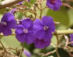 野牡丹是灌木,高0.5-1.5米,分枝多;茎钝四棱形或近圆柱形,密被紧贴的鳞片状糙伏毛,毛扁平边缘流苏状。叶片坚纸质,卵形或广卵形,顶端急尖,基部浅心形或近圆形,长4-10厘米,宽2-6厘米,全缘,7基出脉,两面被糙伏毛及短柔毛,背面基出脉隆起,被鳞片状糙伏毛,侧脉隆起,密被长柔毛;叶柄长5-15毫米,密被鳞片状糙伏毛。