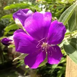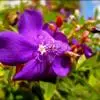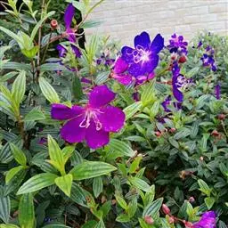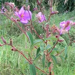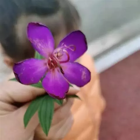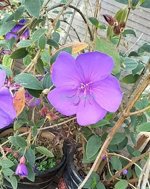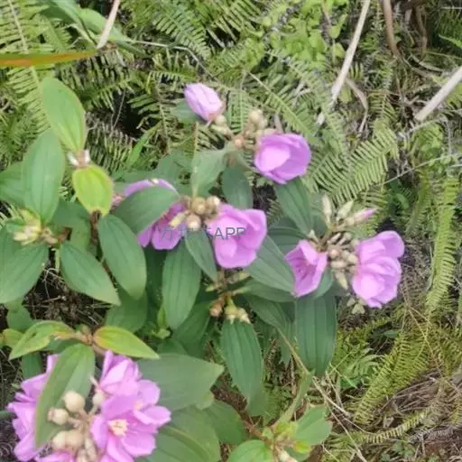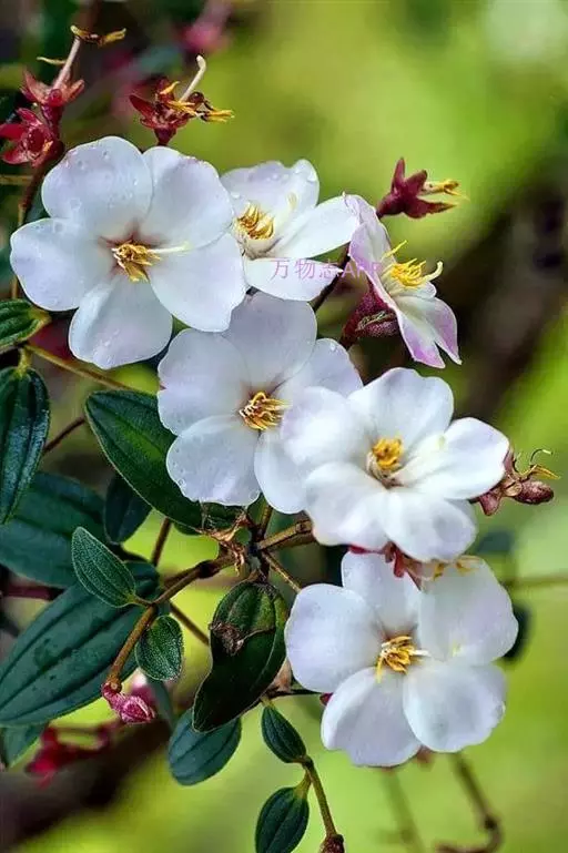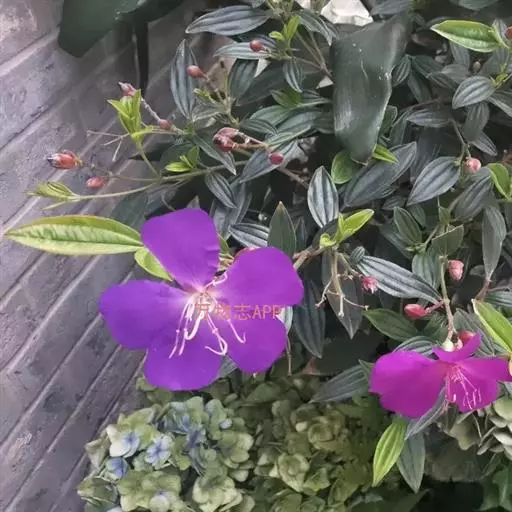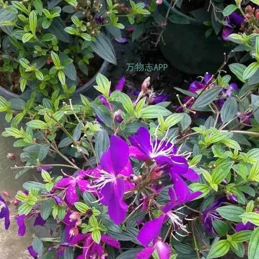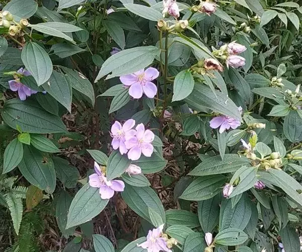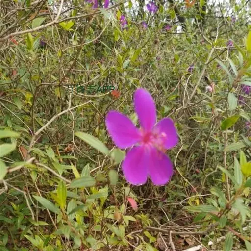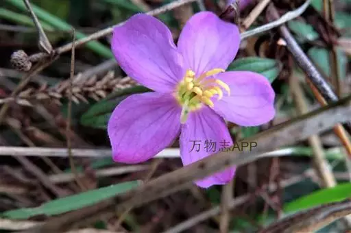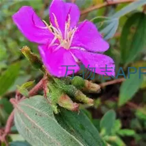野牡丹(学名:Melastoma candidum D. Don):灌木,高0.5-1.5米,分枝多;茎钝四棱形或近圆柱形,毛扁平边缘流苏状。叶片坚纸质,卵形或广卵形,全缘,7基出脉,两面被糙伏毛及短柔毛。伞房花序生于分枝顶端,近头状,有花3-5朵;花瓣玫瑰红色或粉红色,倒卵形,长3-4厘米,顶端圆形,密被缘毛。蒴果坛状球形,与宿存萼贴生,长1-1.5厘米,直径8-12毫米,密被鳞片状糙伏毛;种子镶于肉质胎座内。花期5-7月,果期10-12月。