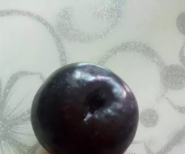 果实扁圆,顶部平圆,缝合线明显、两半对称,果柄粗短,果面紫黑色,果籽少,无果点,果肉乳白、硬,果汁较多,果肉含总糖10.4%、总酸0.8%,糖酸比11.3∶1,可溶性固形物11.5%,离核可食率98.9%。果实耐贮运,在0~5℃条件下可贮藏6个月以上。
