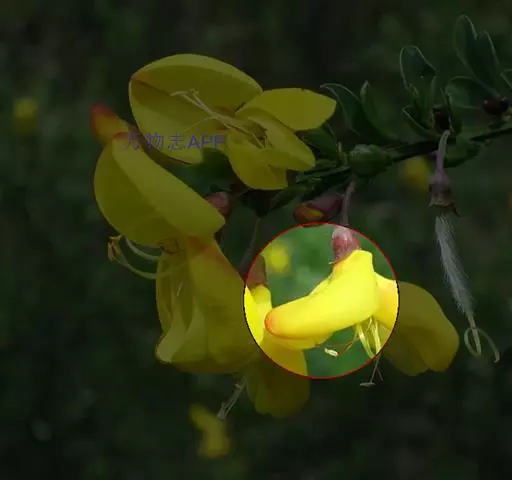 花梗单生,长8-18毫米,关节在中部以上,无毛;花萼管状,不扩大或仅下部稍扩大,长7-9毫米,宽约4毫米,常紫红色,萼齿三角形,渐尖,内侧密被短柔毛;花冠黄色,常紫红色或全部淡红色,凋时变为红色,长20-22毫米,旗瓣长圆状倒卵形,先端凹入,基部渐狭成宽瓣柄,翼瓣长圆状线形,瓣柄较瓣片稍短,耳短齿状,龙骨瓣的瓣柄与瓣片近等长,耳不明显;子房无毛。荚果圆筒形,长3-6厘米,具渐尖头。花期4-6月,果期6-7月。