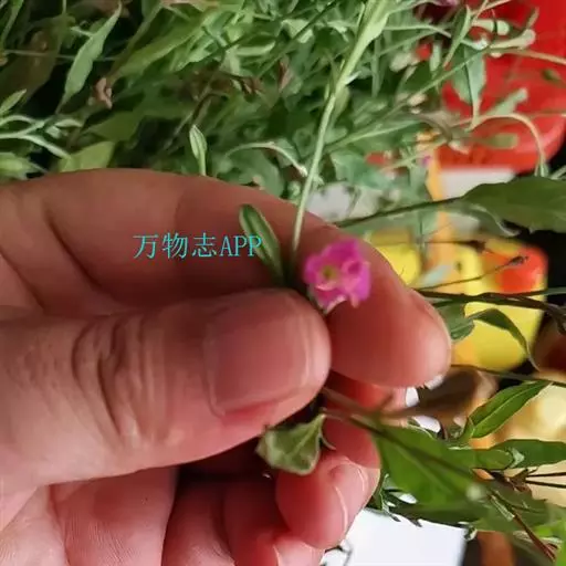 花单生于茎、枝顶部叶腋,近早晨日出开放;花蕾绿色,锥状圆柱形,长1.5-2.2厘米,顶端萼齿紧缩成喙;花管淡红色,长5-8毫米,被曲柔毛,萼片绿色,带红色,披针形,长6-9毫米,宽2-2.5毫米,先端萼齿长1-1.5毫米,背面被曲柔毛,开花时反折再向上翻;花瓣粉红至紫红色,宽倒卵形,长6-9毫米,宽3-4毫米,先端钝圆,具4-5对羽状脉;花丝白色至淡紫红色,长5-7毫米;花药粉红色至黄色,长圆状线形,长约3毫米,花粉约50%发育;子房花期狭椭圆状,长约8毫米,连同花梗长6-10毫米,密被曲柔毛;花柱白色,长8-12毫米,伸出花管部分长4-5毫米;柱头红色,围以花药,裂片长约2毫米,花粉直接授在裂片上。