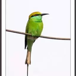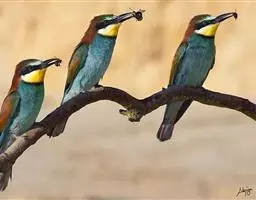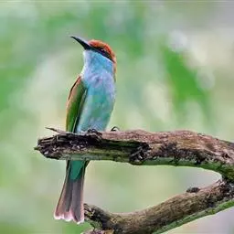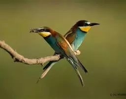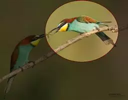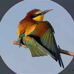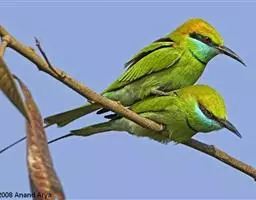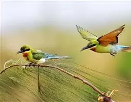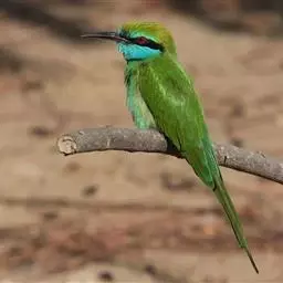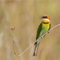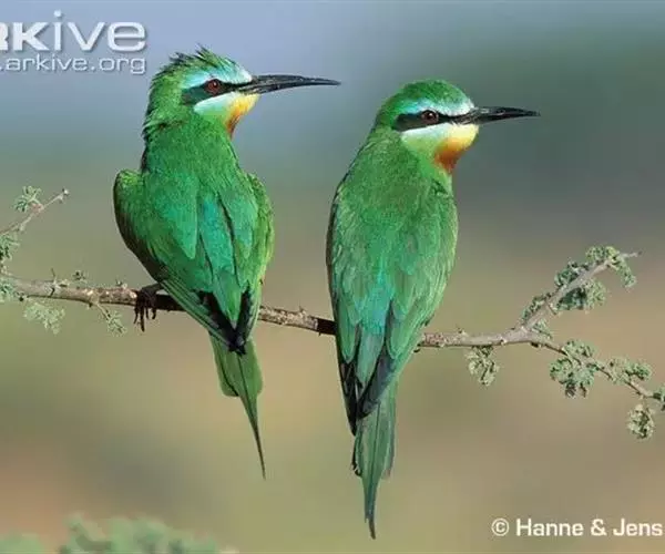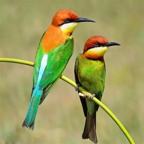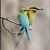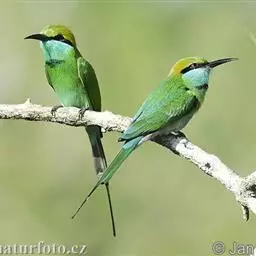 蓝颊蜂虎(学名:Merops persicus):共有2个亚种。体长27-33厘米,翼展46-49厘米,体重38-50克。嘴形细长而下弯,先端尖,嘴峰有棱脊;鼻孔裸露;初级飞羽10片;尾羽12片;体羽质密、正常且无纵纹;尾凸形,中央尾羽特形延长且端部形狭或尖削,脚细弱,中趾与外趾至少连结至基部第二个关节,与内趾则仅于基部的第一个关节并连;翅长而尖,第一片飞羽细小,第二片最长。羽色艳丽,颊蓝绿色显著,两性相似,幼鸟似成鸟。