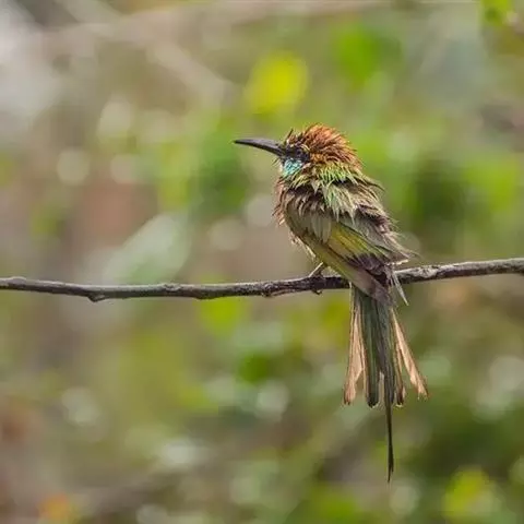 幼鸟上体羽色缺乏光泽;下体喉部栗色较淡,其下呈较多的淡蓝色,少绿色。中央尾羽未延长且缺乏狭形的羽端。