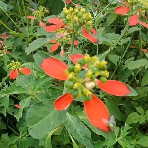 蒴果三棱状球形,长与直径各约1厘米,光滑无毛,花柱早落,成熟时不开裂。种子柱状至卵球状,长6-8毫米,直径4.5-6.0毫米,褐色或灰褐色,无皱纹,具黑褐色斑点;种阜无柄,极易脱落。花期4-7月,果期6-9月。
