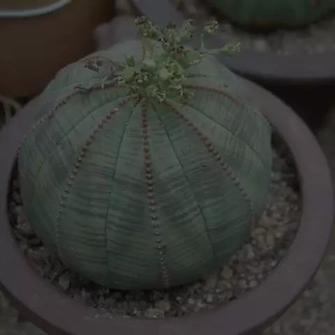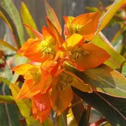 花序单生,近钟状,高约4毫米,直径3-5毫米,边缘5裂,裂片三角状长圆形,边缘浅波状;腺体4,新月形,两端具短角,暗褐色。雄花多数,伸出总苞边缘;雌花1枚,子房柄几与总苞近等长;子房光滑无毛,直径3-6毫米;花柱细长,3枚,分离;柱头2裂。