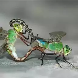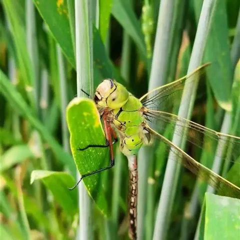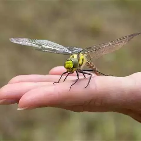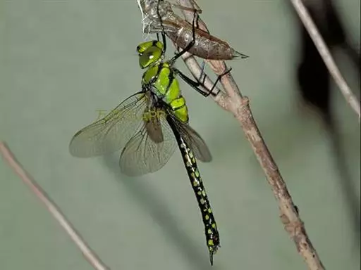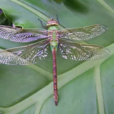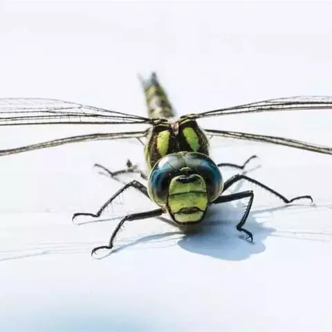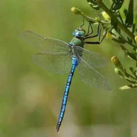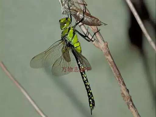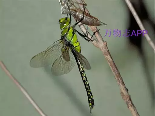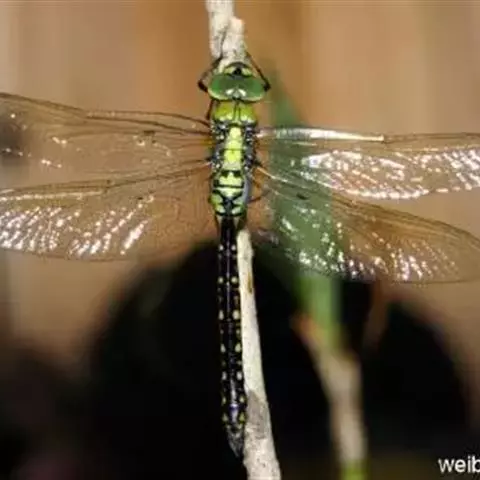 黑纹伟蜓 雄性腹长57mm,后翅长50mm,部下唇黄色,中叶端具黑缘;上唇黄色,具宽的黑色前缘;前唇基黄绿色,前缘中央淡褐;后唇基绿色,前缘两侧具很细的褐色缘;额绿色,上额具1黑色“T”形斑纹。胸部合胸背前方绿色,无斑纹,合胸侧面黄绿色,具黑色条纹,足黑色,翅透明,翅痣黄褐色。 成虫后,未成熟的蜻蜓身体颜色呈现绿色,成熟后的蜻蜓身体呈现蓝色。