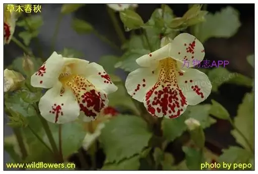多年生草本植物,高30—40厘米。茎粗壮,中空,伏地处节上生根。叶交互对生,卵圆形,长宽近相等,上部略狭。稀疏总状花序,花对生在叶腋内,漏斗状,黄色,花两唇,上两下三裂,花期5~10月通常有紫红色斑块或斑点。种子细小。栽培变种的花冠底色为不同深浅的黄色,上具各种大小不同形状的红、紫、褐斑点。