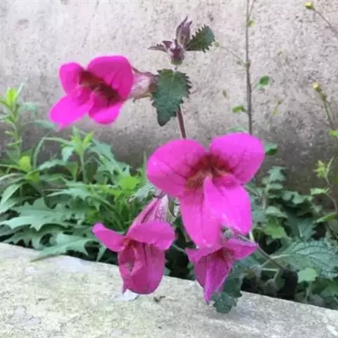 多年生直立草本。株高10-30cm,全体密被白色长腺毛,根肉质。叶基生成丛,倒卵状披针形,基部渐狭成柄,边缘有不整齐钝齿,叶面皱缩,下面略带紫色。花茎由叶丛抽出,花序总状;萼5浅裂;茎紫红色。也多基生,莲座状,卵形至长椭圆形,边缘锯齿。总状花序顶生,花萼筒状,萼齿5枚,花冠紫红色,长约4cm,2唇形,裂片5枚,两面被毛,花期4-5月,果期7~8月。蒴果卵形至长卵形,种子细小。