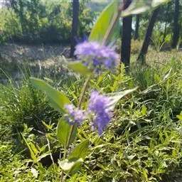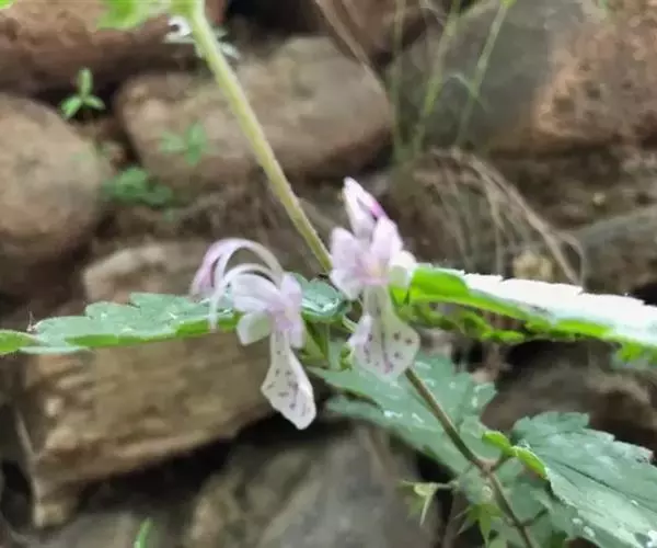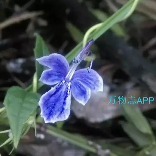 单花莸,为马鞭草科、莸属。多年生蔓性草本,茎基部木质化,枝四方形。叶对生,叶边缘具4~6对钝锯齿,两面被柔毛和腺点。花单生叶腋,5中裂,蓝白色,有紫色条纹和斑点,雄蕊与花柱均伸出花筒外。花期4~8月。
