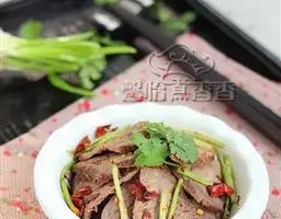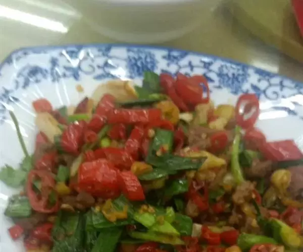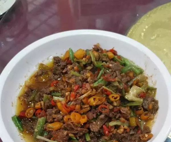 小炒黄牛肉 主料:黄牛肉(牛里脊肉)200克、青尖椒100克、红尖椒100克。