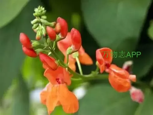 多年生缠绕草本。在温带地区通常作一年生作物栽培,具块根;茎长2-4米或过之,被毛或无毛。羽状复叶具3小叶;托叶小,不显著;小叶卵形或卵状菱形,长7.5-12.5厘米,宽有时过于长,先端渐尖或稍钝,两面被柔毛或无毛。花多朵生于较叶为长的总花梗上,排成总状花序;苞片长圆状披针形,通常和花梗等长,多少宿存,小苞片长圆状披针形,与花萼等长或较萼为长;花萼阔钟形,无毛或疏被长柔毛,萼齿远较萼管为短;花冠通常鲜红色,偶为白色,长1.5-2厘米。荚果镰状长圆形,长(5-)-16(-30)厘米,宽约1.5厘米;种子阔长圆形,长1.8-2.5厘米,宽1.2-1.4厘米,顶端钝,深紫色而具红斑、黑色或红色,稀为白色。
