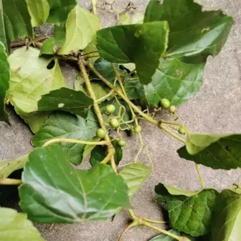 木质藤本。小枝圆柱形,有纵棱纹,无毛。卷须2叉分枝,相隔2节间断与叶对生。叶为单叶,3-5浅裂或中裂,稀混生不裂者,长6-12厘米,宽5-10厘米,心状五角形或肾状五角形,顶端渐尖,基部心形,基缺顶端凹成圆形,边缘有粗锯齿,通常齿尖,上面绿色,无毛,下面粉绿色,无毛或沿脉被疏柔毛;叶柄长3-5厘米,无毛或有时被疏柔毛;托叶早落。多歧聚伞花序与叶对生;花序梗长3-6厘米,无毛或被稀疏无毛;花梗长2-3毫米,伏生短柔毛;花蕾卵圆形,高1.5-2毫米,顶端圆形;萼碟形,边缘呈波状,外面无毛;花瓣5,卵椭圆形,高1.3-1.8毫米,外面无毛;雄蕊5,花药卵圆形,长宽近相等,花盘明显,波状浅裂;子房下部与花盘合生,花柱明显,柱头不扩大。果实近球形,长0.6-10厘米,有种子2-4颗;种子倒卵圆形,顶端近圆形,基部有短喙,种脐在背种子面中部向上渐狭,呈带状长卵形,顶部种脊突出,腹部中棱脊突出,两侧洼穴呈椭圆形,从下部向上斜展达种子上部1/3处。花期5-7月,果期5-9月。