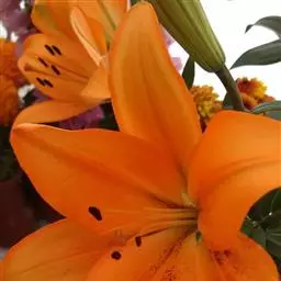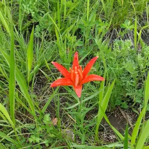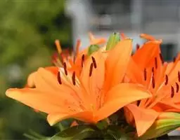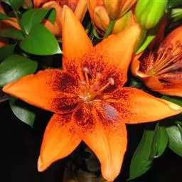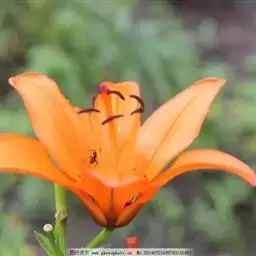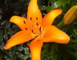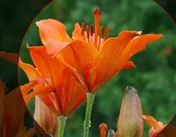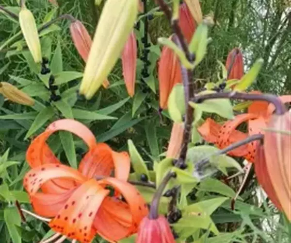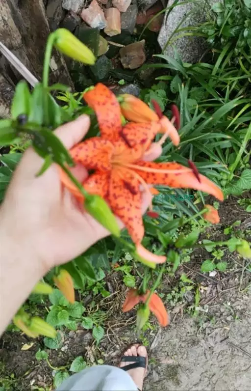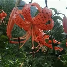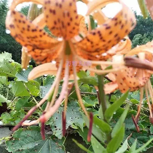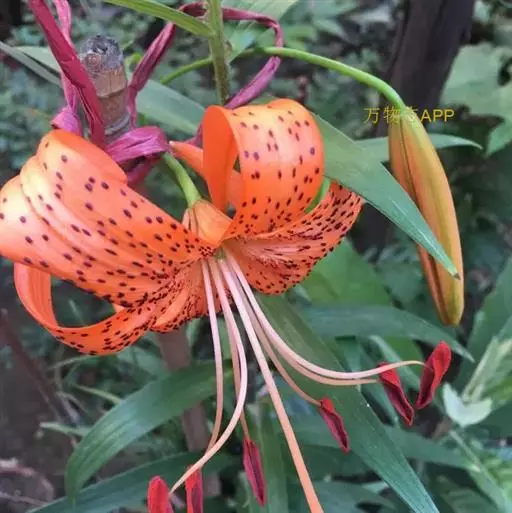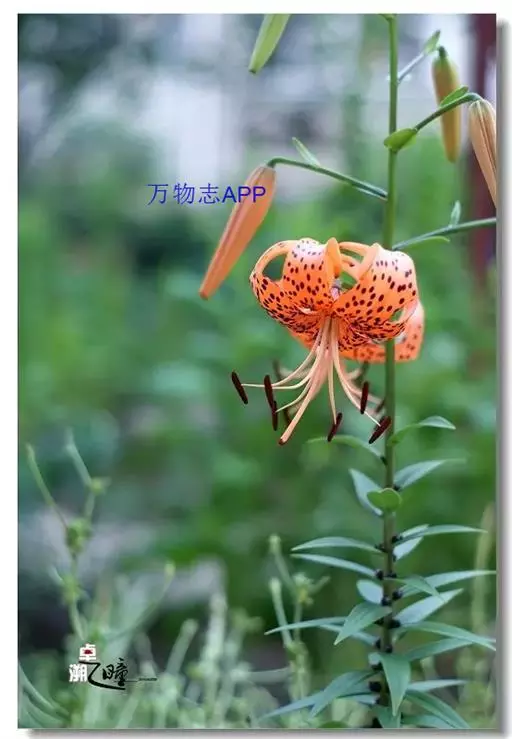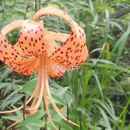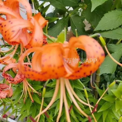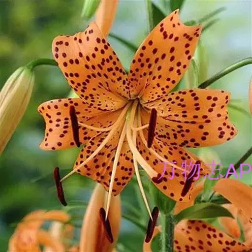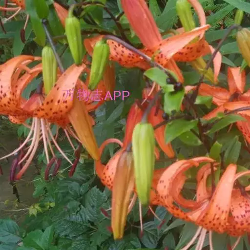 卷丹(学名:Lilium lancifolium Thunb.):卷丹花瓣有平展的,有向外翻卷的,故有“卷丹”美名。鳞茎近宽球形,高约3.5厘米,直径4-8厘米;鳞片宽卵形,长2.5-3厘米,宽1.4-2.5厘米,白色。茎高0.8-1.5米,带紫色条纹,具白色绵毛。叶散生,矩圆状披针形或披针形,两面近无毛,有5-7条脉。花3-6朵或更多;苞片叶状,卵状披针形;花下垂,花被片披针形,反卷,橙红色,有紫黑色斑点。蒴果狭长卵形,长3-4厘米。花期7-8月,果期9-10月。
