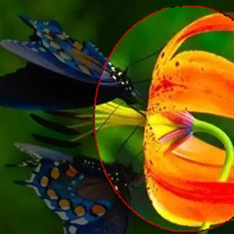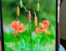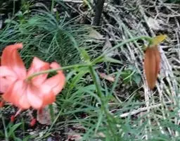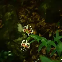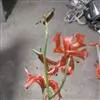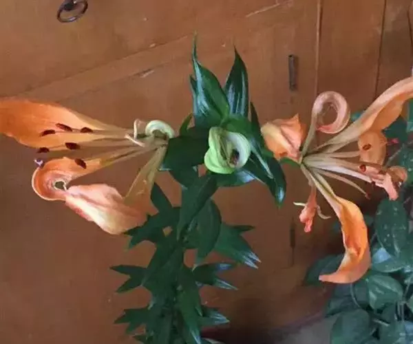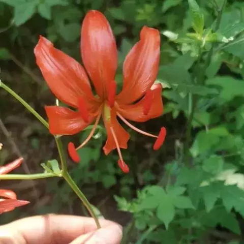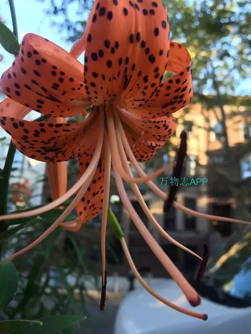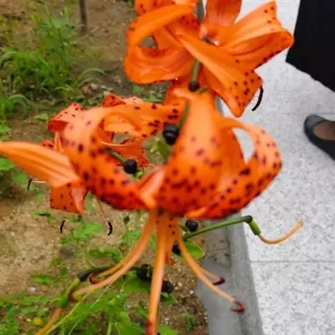 花3-6朵或更多;苞片叶状,卵状披针形,长1.5-2厘米,宽2-5毫米,先端钝,有白绵毛;花梗长6.5-9厘米,紫色,有白色绵毛;花下垂,花被片披针形,反卷,橙红色,有紫黑色斑点;外轮花被片长6-10厘米,宽1-2厘米;内轮花被片稍宽,蜜腺两边有乳头状突起,尚有流苏状突起;雄蕊四面张开;花丝长5-7厘米,淡红色,无毛,花药矩圆形,长约2厘米;子房圆柱形,长1.5-2厘米,宽2-3毫米;花柱长4.5-6.5厘米,柱头稍膨大,3裂。