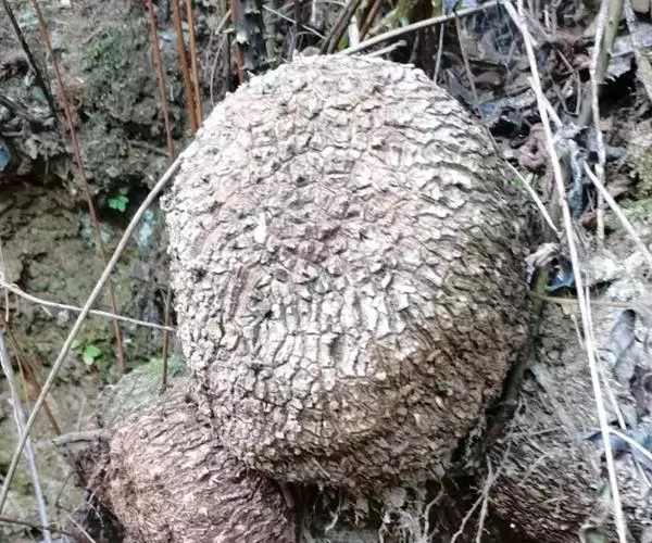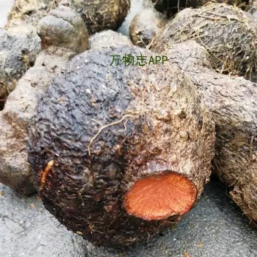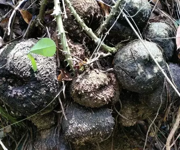 藤本植物,粗壮,长可达20米左右。块茎一般生长在表土层,为卵形、球形、长圆形或葫芦状,外皮黑褐色,凹凸不平,断面新鲜时红色,干后紫黑色,直径大的甚至可达20多厘米。茎绿色,无毛,右旋,有分枝,下部有刺。