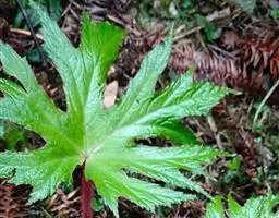 多年生草本。根状茎近球形,直径8-20毫米,具密集而交织的细长纤维状之根。茎直立,有分枝,高40-60厘米,有纵棱,近无毛。基生叶未见。茎生叶互生,具长柄;叶片两侧不相等,轮廓宽卵形至卵形,长10-18厘米,宽7-14厘米,先端渐尖至长渐尖,基部心形,偏斜,窄侧宽1.6-4厘米,宽侧向下延伸长达3-6.5厘米,宽4-8厘米,边缘具不等大的三角形浅齿,齿尖带短芒,并常呈波状或宽三角形的极浅齿,在宽侧出现较多,上面褐绿色,常有红晕,幼时散生硬毛,逐渐脱落,老时近无毛,下面色淡,带红晕或紫红色,沿脉散生硬毛或近无毛,掌状7(-9)条脉,带紫红色,窄侧常2(-3)条,宽侧3-4(-5)条,近中部分枝,呈羽状脉;叶柄长4-13.5厘米,有棱,近无毛;托叶膜质,长圆形至披针形,长约10毫米,宽约2-4毫米,先端渐尖,早落。