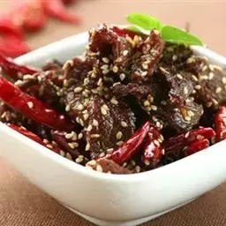 3.锅中加油,下花椒、干辣椒、葱姜煸出香味,放入牛肉条爆炒,加盐、白糖、辣椒油爆炒。加入芝麻,翻炒均匀后即可出锅。