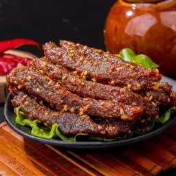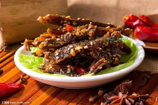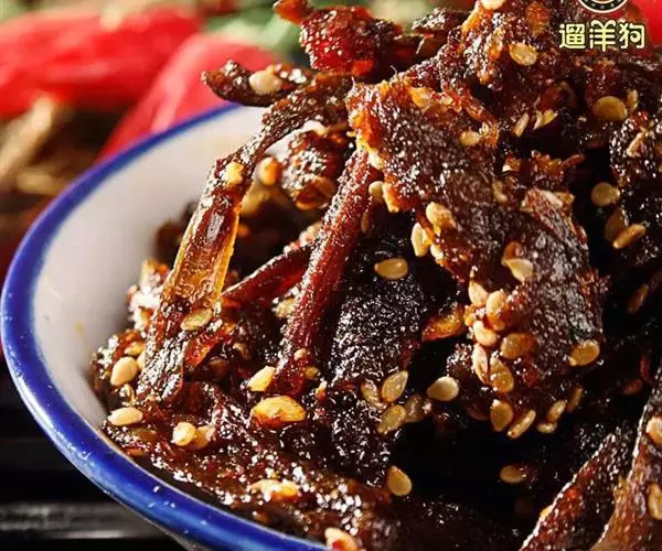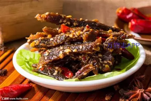 色泽红亮,质地干香酥脆,麻辣味厚,为喝酒佳品。