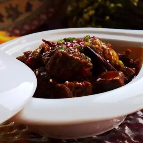 9. 锅内留30克油,下入花椒、干辣椒、葱姜煸出香味加入汤,放入炸好的牛肉条、精盐、白糖、料酒烧制;