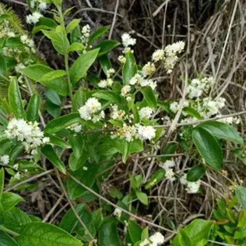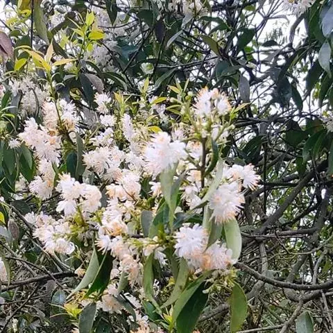 圆锥花序长5-8厘米,通常有柔毛;苞片早落,通常条形,有褐色腺点;花萼长2-3毫米,萼筒褐色,无毛或有疏柔毛,裂片半圆形或卵形,稍长于萼筒,淡黄色,有纵脉纹,边缘有毛;花冠白色,长4-5毫米,5深裂几达基部;雄蕊40-60枚,子房2室,花盘具5凸起的腺点。