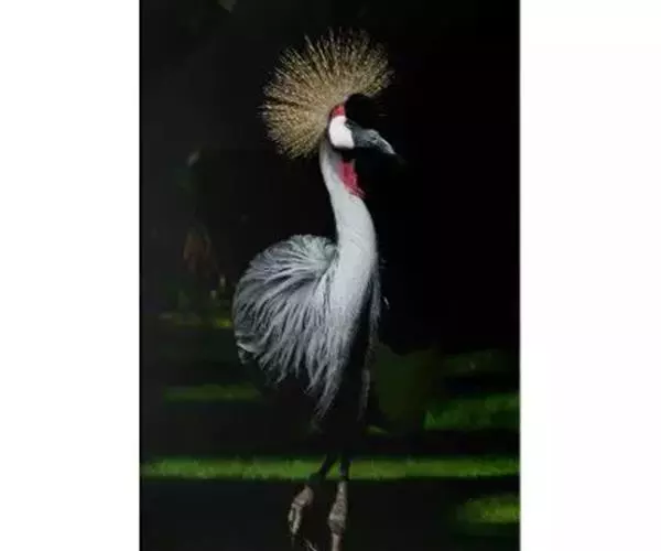 灰冠鹤头体高100-110厘米,翼展180-200厘米,体重3-4千克。 具有瘦长挺立的双腿,伸展自如的长颈,优美动人的体态,大有超凡脱俗之气概。它的雄鸟与雌鸟的羽色非常相似,全身的羽毛都呈深浅不同的灰色,飞羽为白色,翼尖和尾羽为棕褐色,光华熠熠。但最为楚楚动人之处,还是它的头部,清癯的双颊上嵌着上面是小块红色,下面为大块白色的斑块,以及一对炯炯有神的小圆眼睛,喉下悬垂着两个红色的大肉垂。头顶前部的羽毛象覆盖着一块乌黑的绒缎,柔软光洁,后部则佩戴着一顶挺硬的丝毛织成的锦冠,金光闪耀,就象皇冠一样美丽。