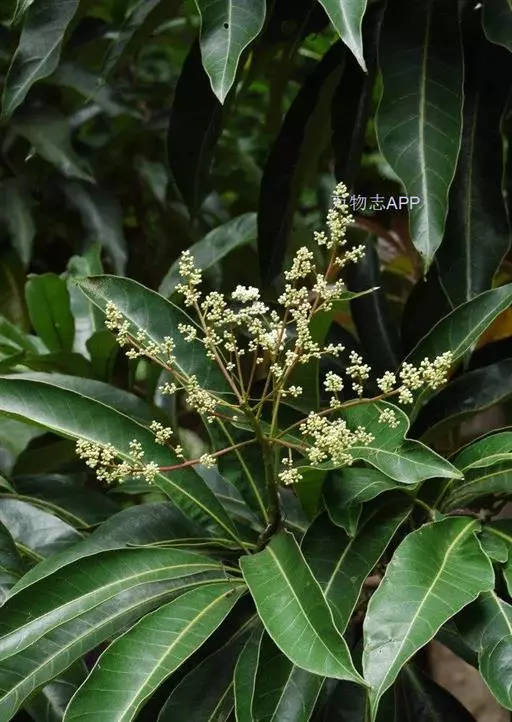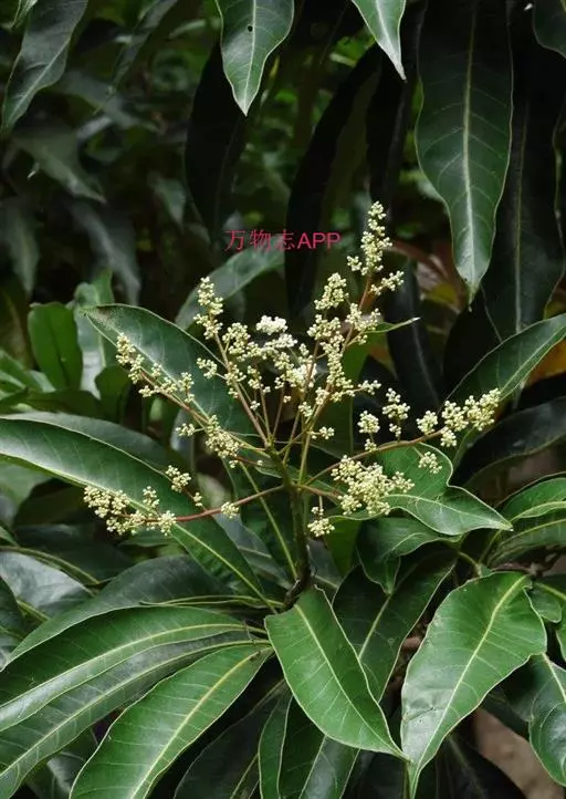 大叶肉托果 叶互生,常集生于小枝顶端,革质,椭圆状披针形或卵状披针形,长25-50厘米,宽5.5-12厘米,先端急尖或短渐尖或短尾尖,基部钝,两面无毛;叶面略具光泽,叶背苍白色,中脉在叶面平或略突,在叶背突起,侧脉约20对,与中脉成70度角,网脉两面突起;叶柄长1-3厘米。圆锥花序顶生,长约17厘米;花白色,花梗短,长约2毫米,苞片三角形,长约1毫米,边缘具细睫毛;花萼钟状,长约2.5毫米,萼齿明显或不明显;花瓣卵状披针形,长约5.5毫米,宽约2.5毫米,先端钝,基部截形;雄蕊与花瓣互生,比花瓣短,花丝线形,长约3毫米,花药长圆形;子房阔卵形,长约2毫米,胚珠悬垂于中上部。核果扁球形,先端偏斜,急尖,长约2.3厘米,宽约2厘米。