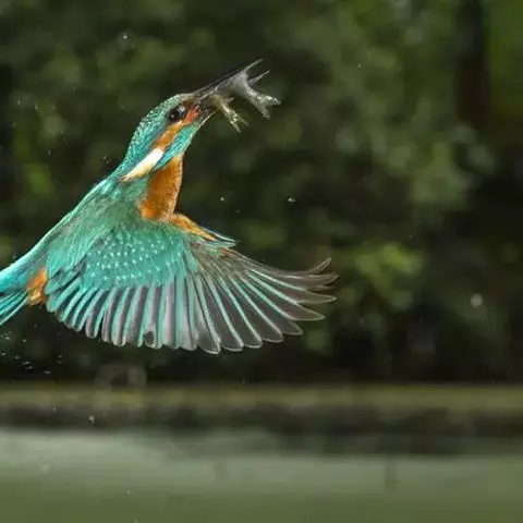绿鱼狗是佛法僧目翠鸟科的鸟类。成年雄鸟,额头和眼先是黑色,头顶端深绿色呈古铜光泽。翅膀羽毛有白色斑…