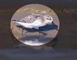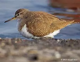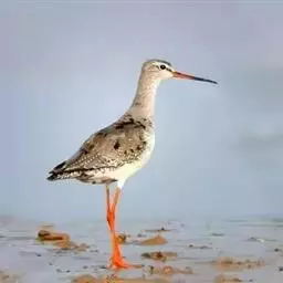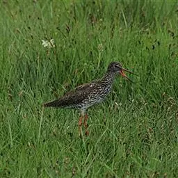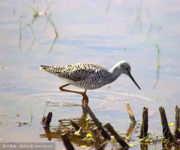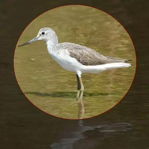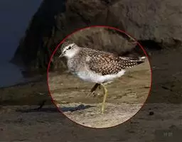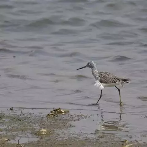 红脚鹬:体长28厘米,上体褐灰,下体白色,胸具褐色纵纹。飞行时腰部白色明显,次级飞羽具明显白色外缘。…