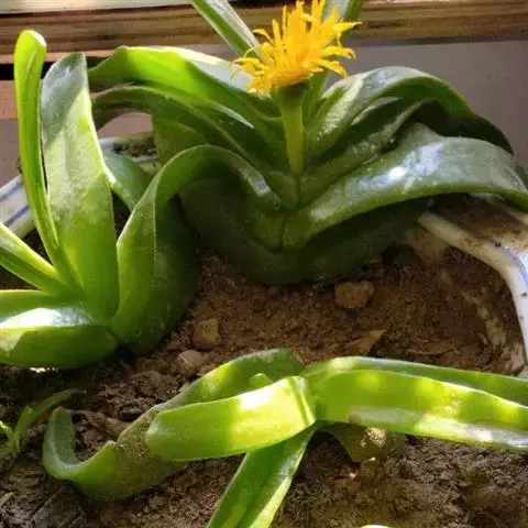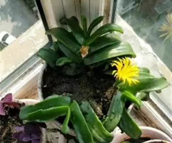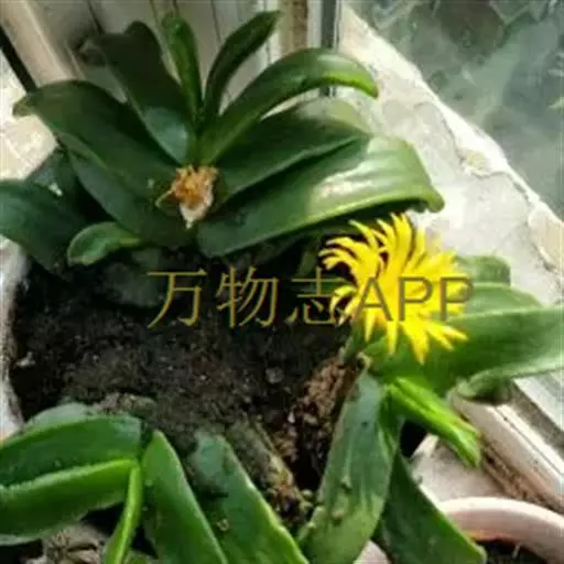 多年生,茎肉质,叉状分枝。叶片舌状或三角状线形,肥厚多肉,鲜绿色,交互对生,紧密排成2列,长约6厘米,宽约1.5厘米,顶端具钝弯钩,基部合生。花顶生,具细长梗,橙黄色,直径约2厘米;花瓣和雄蕊均多数;花托膨大。花期5-6月。